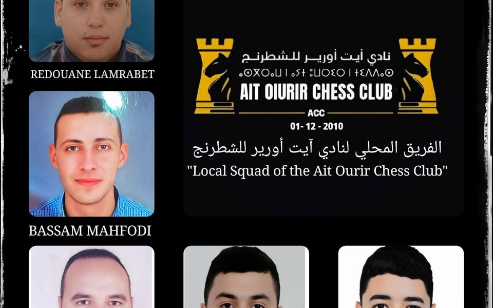 Voici la liste des membres de l'équipe locale du Ait Ourir Chess Club, telle que présentée dans l'image : 1. Redouane Lamrabet 2. Bassam Mahfodi 3. Jamal Ait Oughri 4. Yassine Bourrich 5. Amine Ihizi