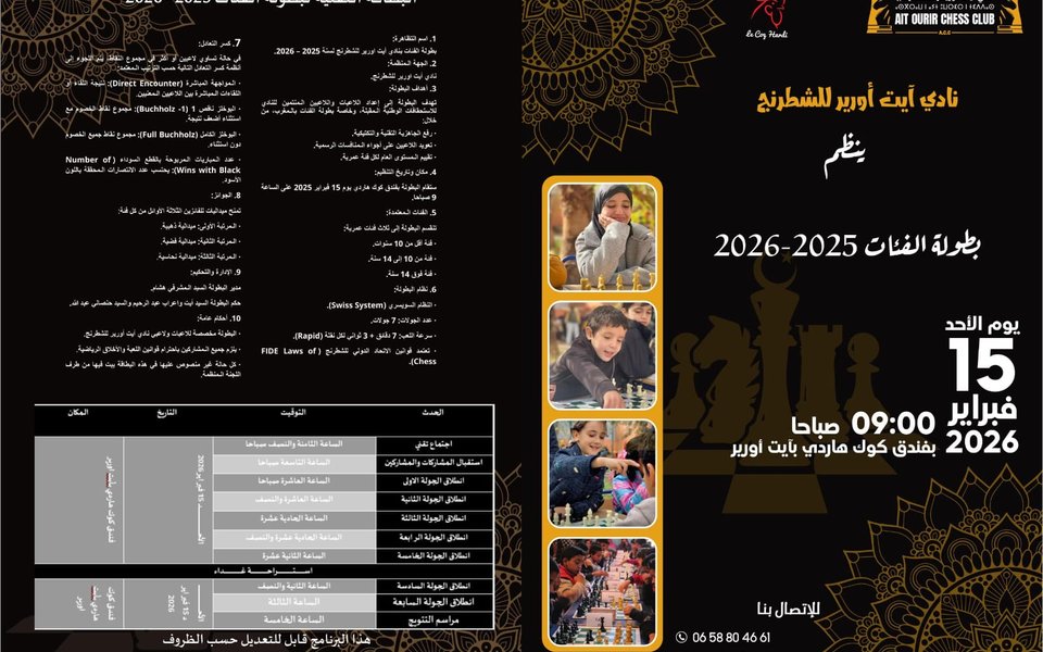 Dans le cadre de sa volonté constante de promouvoir la culture des échecs et de diffuser ses valeurs éducatives et intellectuelles, Aït Ourir Chess Club organise le Championnat des catégories pour la saison sportive 2025–2026. Cette manifestation sportive, destinée aux enfants et aux jeunes, vise à affiner les talents émergents, à renforcer l’esprit de compétition loyale et à développer les capacités de réflexion et de concentration.